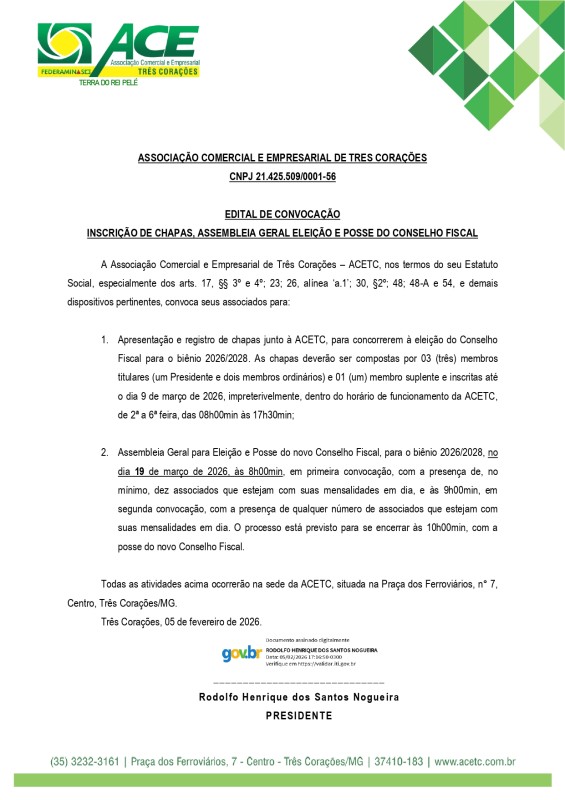 Edital de Convocação INSCRIÇÃO DE CHAPAS, ASSEMBLEIA GERAL ELEIÇÃO E POSSE DO CONSELHO FISCAL